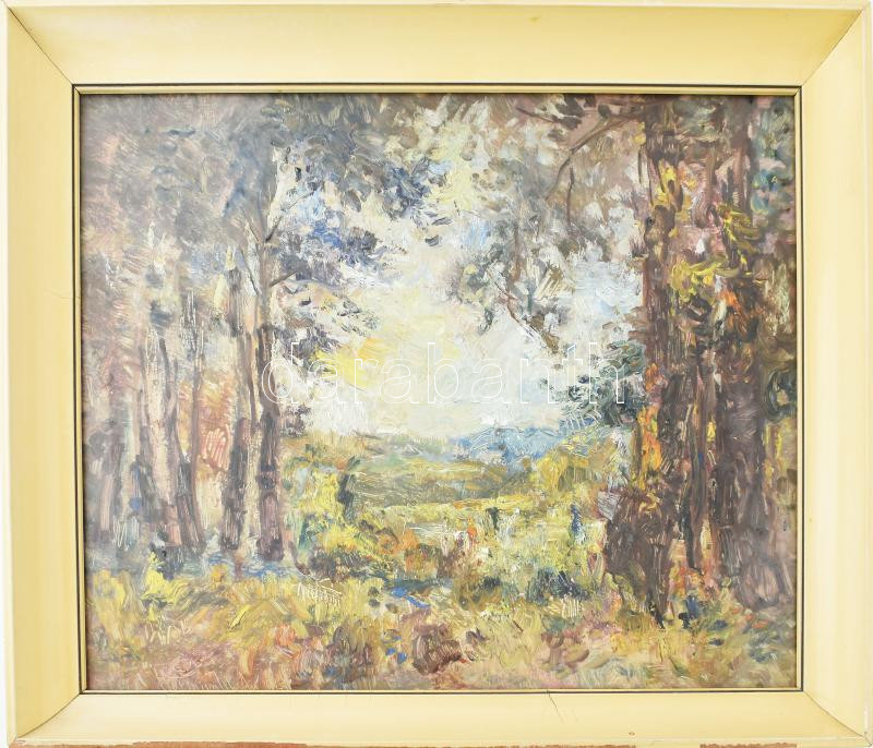 Leírás: Herman Lipót (1884-1972): Börzsönyben. Olaj, farost, jelezve balra lent. Hátoldalán Képcsarnok Vállalat címkéjével. Üvegezett fakeretben, 40×50 cm.
