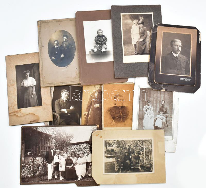 Leírás: 12 db régi kabinetfotó és nagyobb méretű fotó vegyes műtermekből, vegyes állapotban