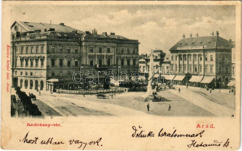 1903 Arad, Andrássy tér, Színház, Múzeum, Színházi sörcsarnok és étterem, Nagy Lajos szállodája a Fehér kereszthez, kávéház, üzletek. Kerpel Izsó kiadása / theatre, museum, street view, beer hall, hotel and café, shops (EK)