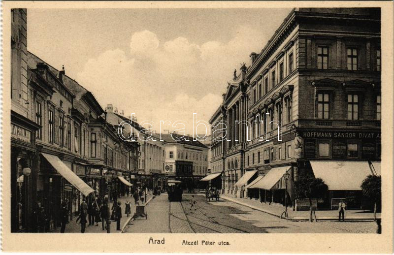 Arad, Atczél Péter utca, Hoffmann Sándor divatáruháza, Lengyel Testvér... https://www.darabanth.com/hu/460-Gyorsarveres/460.0/Kepeslapok/Erdely~1500006/Arad-Atczel-Peter-utca-Hoffmann-Sandor-divataruhaza-Lengyel-Testverek-uzlete-villamos-s~II2952216