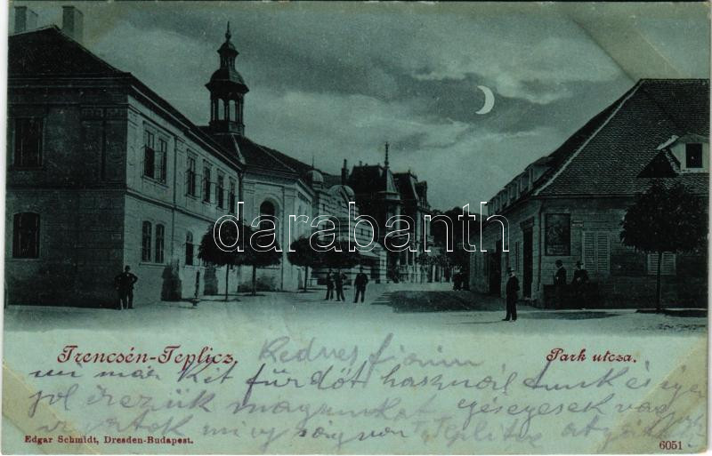 Leírás: 1900 Trencsénteplic, Trencianske Teplice; Park utca este / street at night