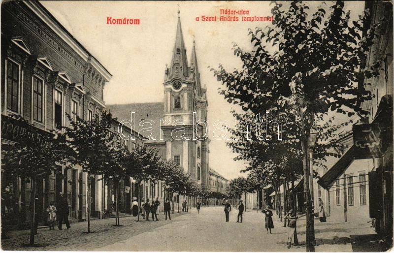 1910 Komárom, Komárno; Nádor utca, Szent András templom, üzletek. Czik... https://www.darabanth.com/hu/460-Gyorsarveres/460.0/Kepeslapok/Felvidek~1500007/1910-Komarom-Komarno-Nador-utca-Szent-Andras-templom-uzletek-Czike-Denes-kiadasa-street~II3083919