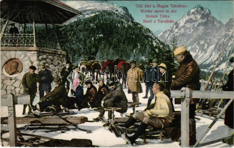 1910 Tátra, Magas-Tátra, Vysoké Tatry; téli élet Szilágyi Dezső emlékműnél, téli sport, kormányozható szánkók / winter sport at the monument, controllable sleds