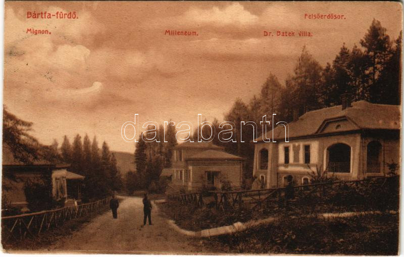 Leírás: 1911 Bártfa, Bártfafürdő, Bardejovské Kúpele, Bardejov; Felső erdősor, Mignon, Milleneum, Dr. Batek villa. Divald 27-1909 / villas