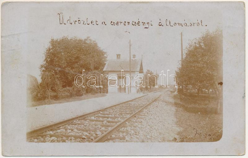 Leírás: 1913 Cserencsény, Cerencany (Rimaszombat, Rimavska Sobota); 9-es számú vasútállomás őrház bakterrel. Ritka felvétel! / railway station guard house. Zólyomi photo, very rare! (EK)