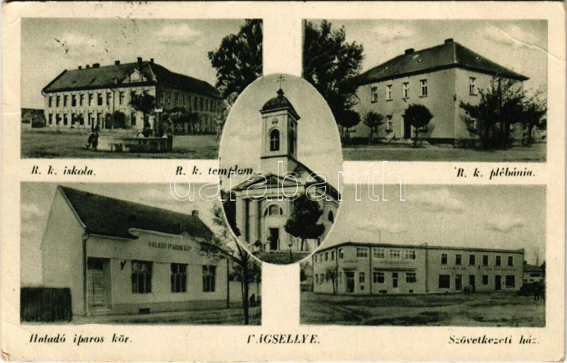 1943 Vágsellye, Schelle, Sala nad Váhom; Római katolikus iskola, plébánia és templom, Haladó iparos kör, Szövetkezeti ház / Catholic school, parish and church, cooperative (EB)