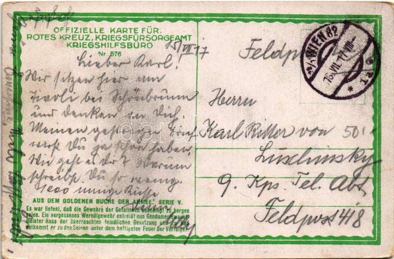 1917 Offizielle Karte für Rotes Kreuz, Kriegsfürsorgeamt, Kriegshilfsbüro Nr. 576. Aus dem goldenen Buche der Armee Serie V. / WWI Austro-Hungarian K.u.K. military art postcard, support fund s: Fr. Jung (EK)