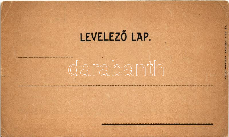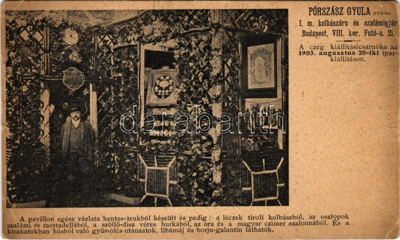 Budapest VIII. Pórszász Gyula I. m. kolbászárú és szalámigyár (Futó utca 21.): A czég kiállításcsarnoka az 1903. augusztus 20-iki iparkiállításon. A pavillon egész vázlata hentes árukból készült és pedig: a lécek tiroli kolbászból, az oszlopok szalámi és mortadellából, a szőlő dísz véres hurkából, az óra és a magyar címer szalonnából. És a kirakatokban húsból való gyümölcsutánzatok, libamáj és borjú-galantin láthatók. Anglo-Nyomda kiadása (kis szakadás / small tear)