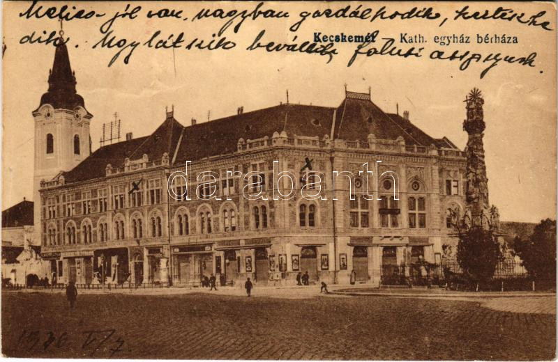 Leírás: Kecskemét, Katolikus egyház bérháza, üzletek. Vasúti levelezőlapárusítás 470.