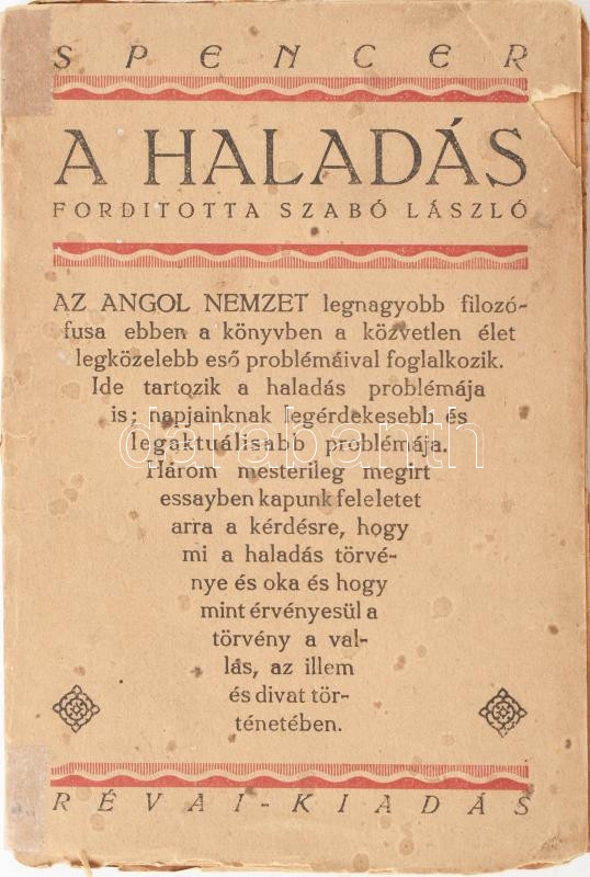 Herbert Spencer: A haladás. Bp., 1919, Révai. Kiadói papírkötés, javít... https://www.darabanth.com/hu/460-Gyorsarveres/460.0/Konyvek/Konyvek-Tarsadalomtudomany~1000026/Herbert-Spencer-A-haladas-Bp-1919-Revai-Kiadoi-papirkotes-javitott-gerinccel-serult~II3084812
