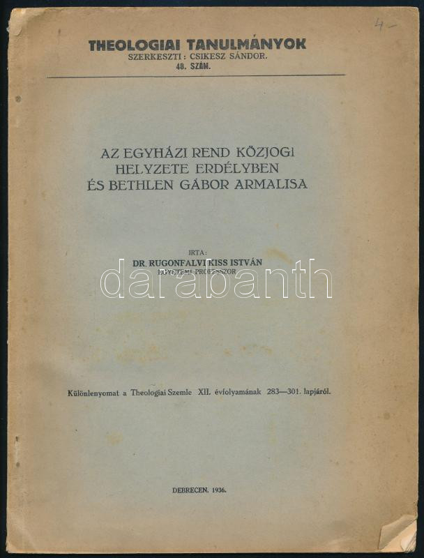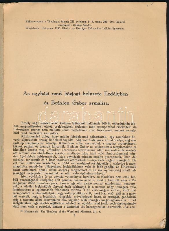 Rugonfalvi Kiss István, Dr.: Az egyházi rend közjogi helyzete Erdélyben és Bethlen Gábor armalisa. Debrecen, 1936. 283-301p. Különlenyomat papírborítóval