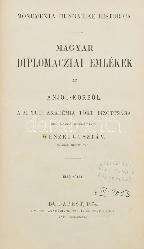 Wenzel Gusztáv: Magyar diplomáciai emlékek az Anjou-korból. Szerk.: - -. Monumenta Hungariae Historica. Magyar történelmi emlékek IV. Diplomacziai emlékek. I. Bp., 1874, MTA, (Athenaeum-ny.),XXX+423 p. Nagyrészt latin, kisebb részben magyar nyelven. Korabeli félvászon-kötés, kopott borítóval.