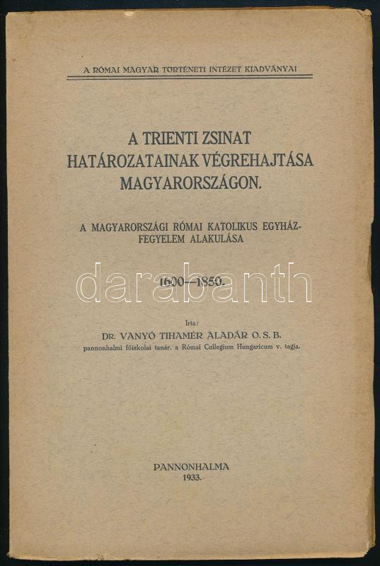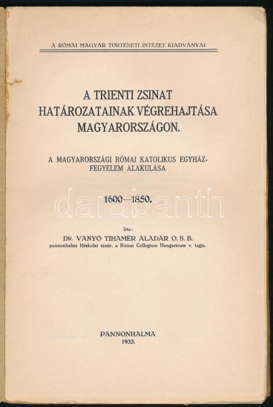 Vanyó Tihamér Aladár: A trienti zsinat határozatainak végrehajtása Magyarországon. A magyarországi római katolikus egyház fegyelem alakulása. 1600-1850. Különlenyomat. Római Magyar Történeti Intézet kiadványai. Pannonhalma, 1933, (Bp., Korda Rt.-ny.) Kiadói papírkötés, felvágatlan lapokkal.