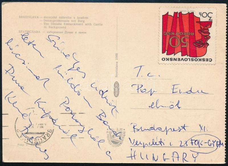 Leírás: Kemény Dénes (1954- ) vízilabdázó, edző saját kezű sorai és aláírása Pozsonyból hazaküldött képeslapon