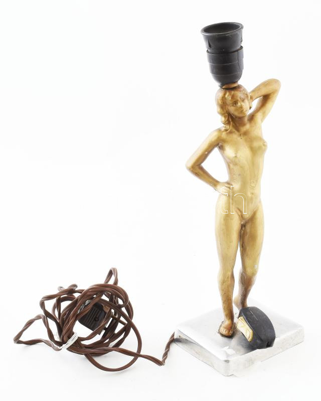 Leírás: Art deco fém női akt alakkal díszített váza, bronzírozott fém szerelékén sérüléssel, m: 36 cm