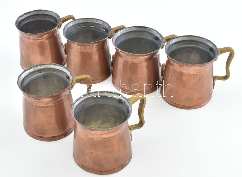 Leírás: cca 19. sz. vége, Antik réz korsó készlet, 6 db, belül ónozott, korának megfelelő állapotban, m: 9 cm