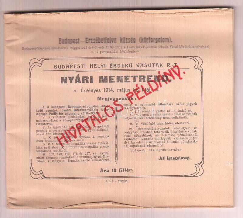1914 Budapesti Helyi Érdekű Vasutak Rt. Nyári Menetrend. Bp., 1914, B. H. É. V. ny. Kiadói tűzött papírkötés, az elülső és a hátsó borítón piros bélyegzéssel (hivatalos példány).