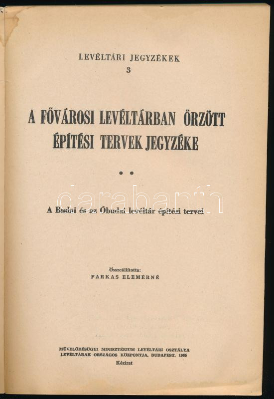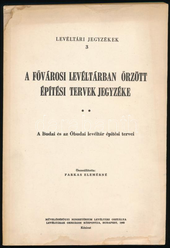 Farkas Elemérné: A FÅ‘városi Levéltárban Å‘rzött épÃtési tervek jegyzéke. A Budai és az Óbudai levéltár épÃtési tervei. Összeáll.: - - . Levéltári Jegyzékek 3. Bp., 1965, MűvelÅ‘désügyi Minisztérium Levéltári Osztálya - Levéltárak Országos Központja, 556 p. Kiadói papÃrkötés, a borÃtón és a lapok sarkán helyenként foltokkal. Megjelent 500 példányban.