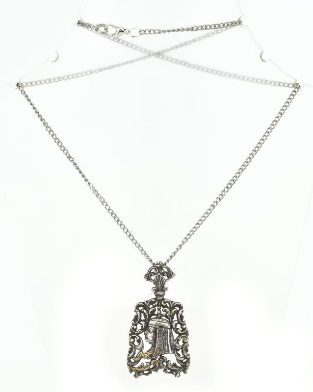 Leírás: 3 db bizsu nyaklánc, medálokkal (egyiptomi fejes, virágos, ametisztszínű köves)