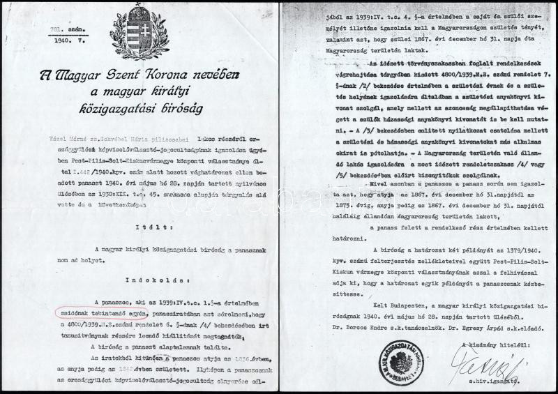 1940 Eredeti okmányról készült fénymásolat, mely arról szól, hogy zsid...