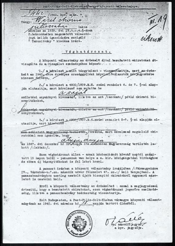 1940 Eredeti okmányról készült fénymásolat, mely arról szól, hogy zsidó származás miatt elutasították a panaszos kérését