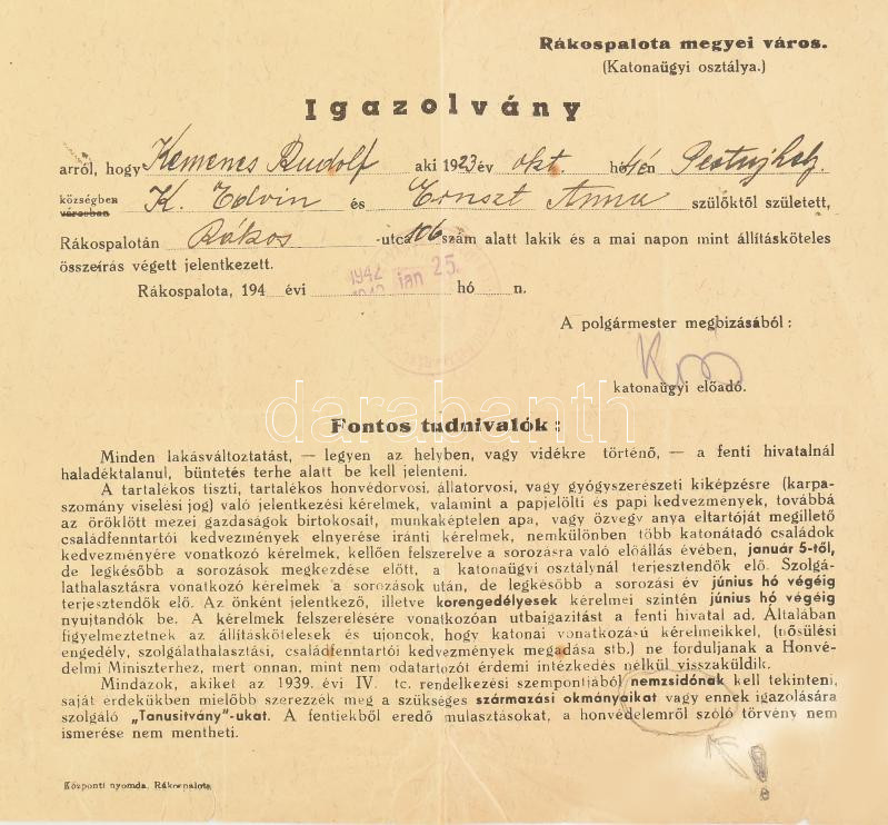 Leírás: 1942, Igazolvány állításköteles összeírásra jelentkezésről. Tudnivalók között nemzsidókra vonatkozó rendelkezésekkel. Hajtott.