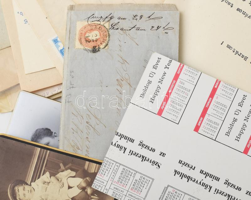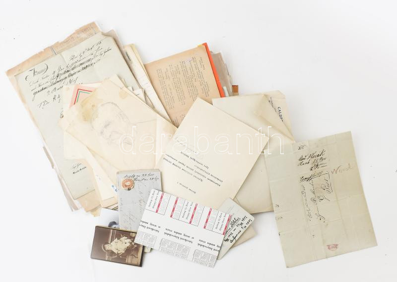 Leírás: Vegyes papírrégiség hagyaték: fotók, régi levelek, nyomtatványok, okmánybélyeges iratok, néhány vizitkártya, stb