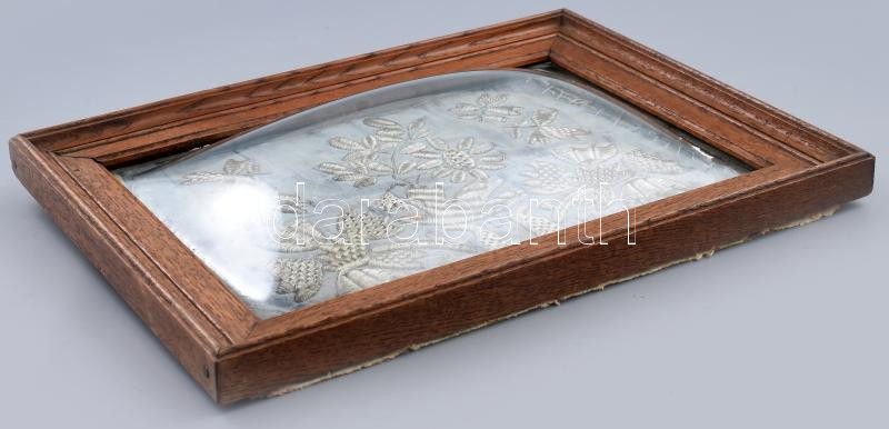 Leírás: Falikárpit részlet, XVIII. sz. ezüst szállal hímzett (skófium) XIX. sz-i domború üvegű fa keretben 36x26 cm