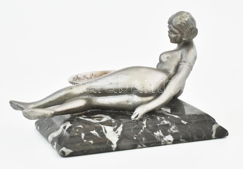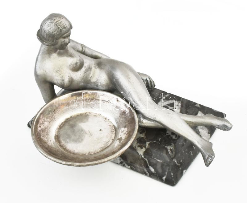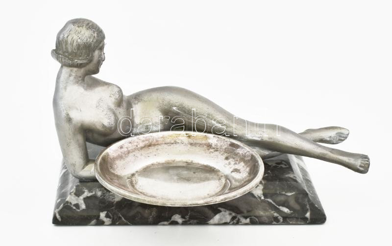 Leírás: Fekvő női akt figurális asztali ékszertartó. Összeállítás fém szobor és WMF tálka felhasználásával, márvány talapzaton, kis kopással, 16x14x10 cm