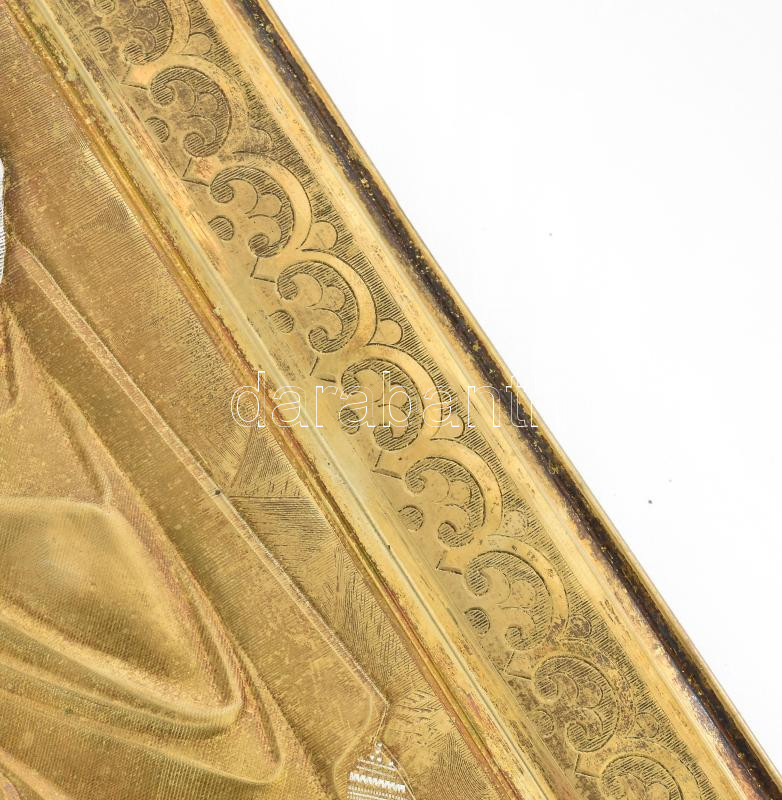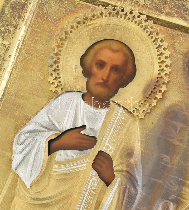 Ikon. Szent Pál és Szent Péter. Orosz ikonfestő, Moszkva, 1908-1926 között. Tojástempera, fa, néhol foltos bársony borítással. Aranyozott ezüst (Ag) okláddal, ezüst- és mesterjeggyel jelzett, 84-es kokoshnik ezüstjel (875/1000), kis elszíneződéssel, glóriák is jelzettek, 26,5x22 cm