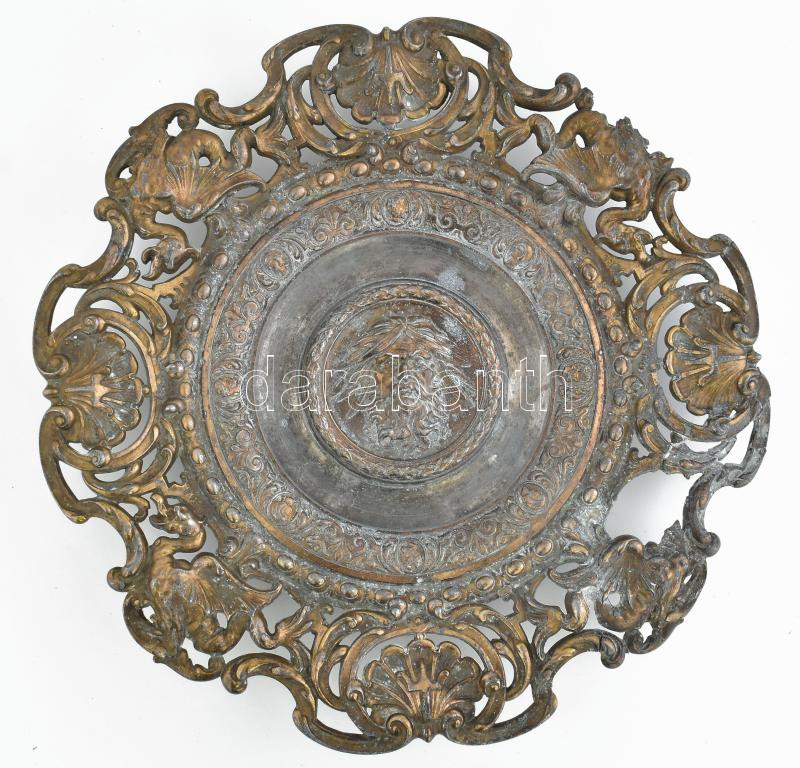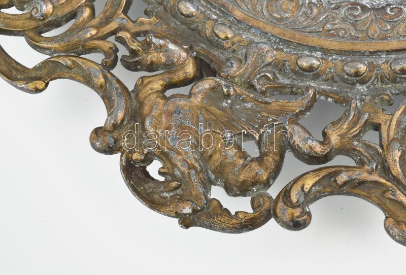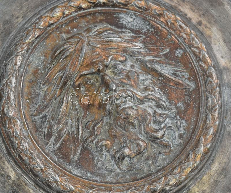 Leírás: Neptunus tematikájú szervírozótál, asztalközép. Öblében pontsoros és mintasoros díszítéssel körbevett Neptunus ábrázolás, pereménél rokályokkal egybekötött tengeri motívumok. Bronzírozott spiáter, kopással, kis darabja letört, de megvan, d: 39 cm