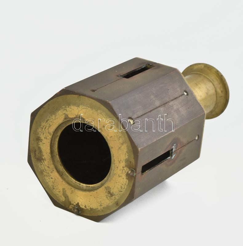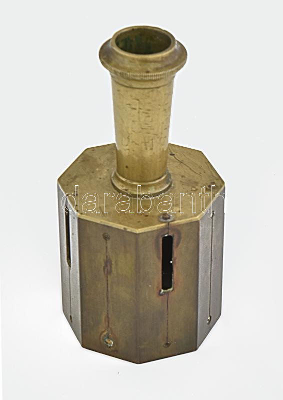 Leírás: Pantométer, régi földmérő eszköz (szögek, magasságok és hosszúságok mérésére szolgáló műszer). Réz, jelzés nélkül, hiányos, h: 12 cm