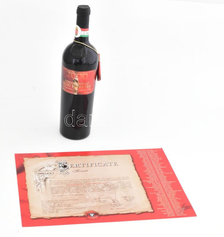 1997 Az Ezredforduló egri bikavére az államlapítás tiszteletére. Bontatlan palack vörösbor, kitöltetlen certifikáttal, melynek sorszáma megegyezik a boron lévővel, bontatlan, 12,5%, 0,75l.