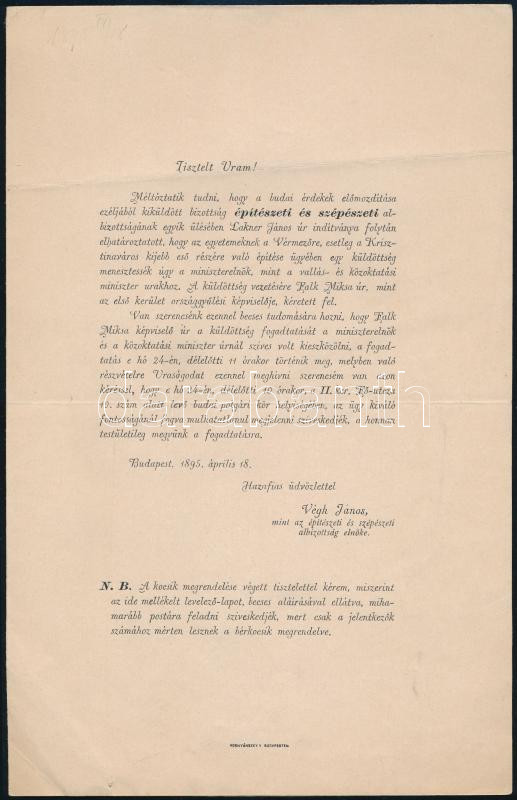 Leírás: 1895 A budai érdekek előmozdítása céljából kiküldött bizottság építészeti és szépészeti albizottságának meghívója
