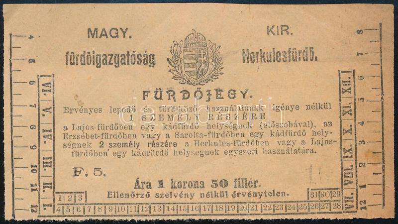 Leírás: 1914 Herkulesfürdői (Erdély) teljes árú fürdőjegy egyszeri kádfürdői helyiség használatára, szép állapotban