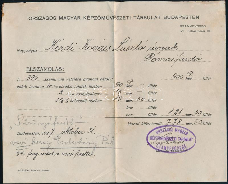 Leírás: 1927 Kézdi-Kovács László festőművész elszámolása egy Esterházy Pál hercegnek eladott festményről