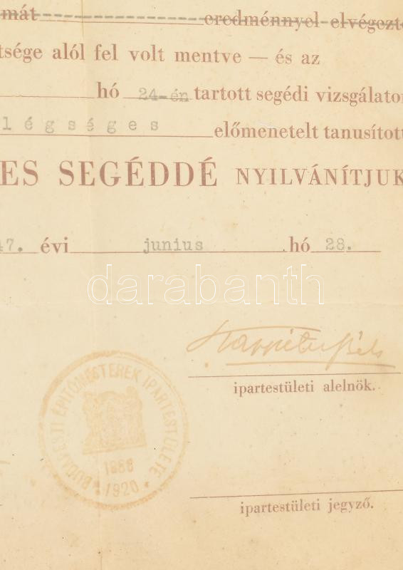 1947 Budapesti Építőmesterek Ipartestülete által kiállított kőműves se... https://www.darabanth.com/hu/460-Gyorsarveres/460.0/Mutargy-papirregiseg-egyeb/Okmanyok~500020/1947-Budapesti-Epitomesterek-Ipartestulete-altal-kiallitott-komuves-segedlevel-alairasokkal-1Ft~II3080280
