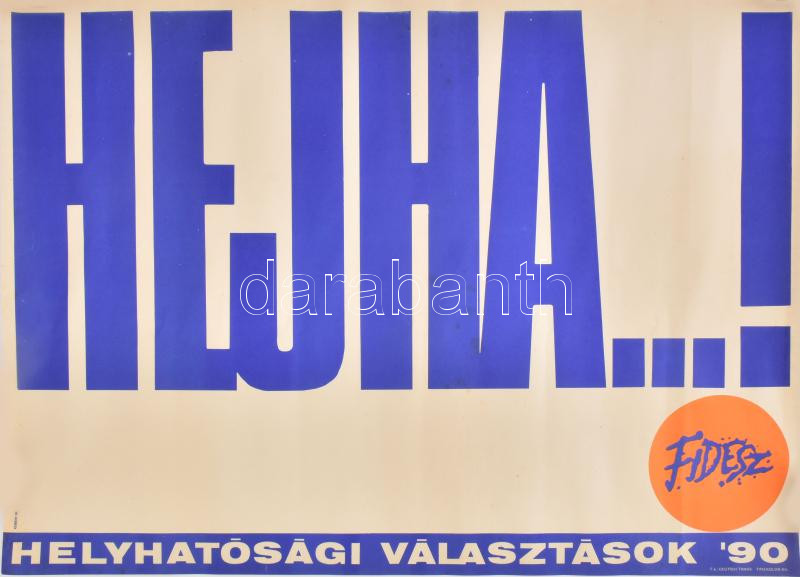 Kemény György (1936- ): "Hejha...!" Helyhatósági választások '90, Fidesz választási plakát, 1990. F.k.: Deutsch Tamás, TIPO-KOLOR Kft., feltekerve, kis foltokkal, az egyik sarkán kis gyűrődéssel, 69x49 cm