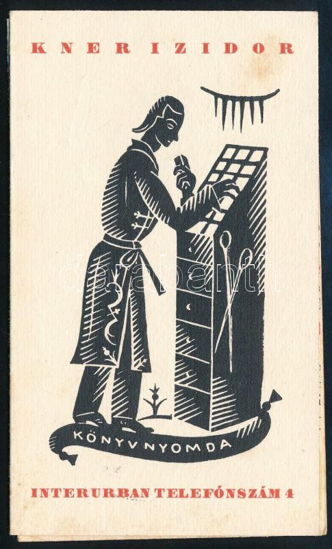 1926 Gyoma, Kner Izidor könyvnyomda és kiadóvállalat kihajtható reklámlapja, a pengő bevezetése miatt szükségessé váló új nyomtatványokkal kapcsolatban, Csabai Ékes Lajos (1896-1944) illusztrációival, kihajtva: 29,5x12,5 cm