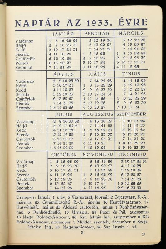 1933 Dr. Rosenberg Sándor gyógyszerészeti laboratórium (Bp. VII., Károly király út 3/a) előjegyzési napló és naptár az 1933. évre. Benne hasznos egészségügyi tudnivalókkal, reklámokkal, bejegyzésekkel (kézzel írt és beragasztott receptek, stb.) Kiadói aranyozott gerincű egészbőr-kötésben, kissé viseltes, kopottas borítóval.
