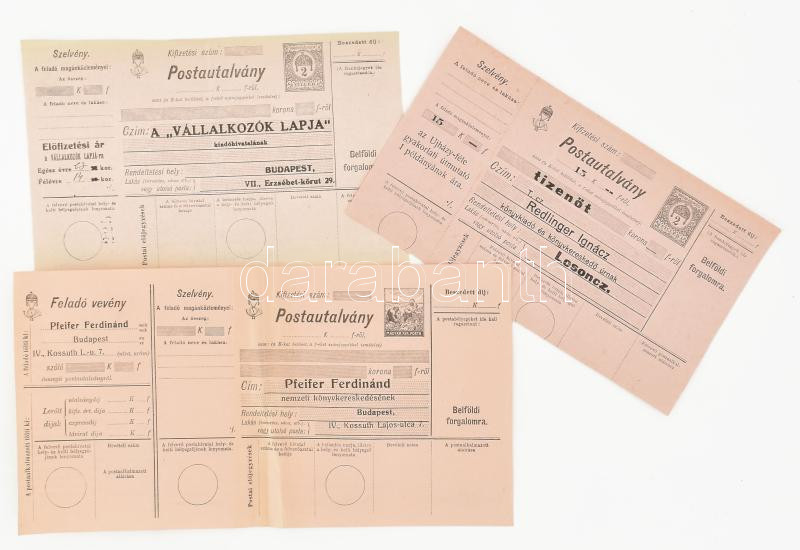 Leírás: 3 db céges postautalvány Redlinger Ignác könyvkiadó, Vállalkozók lapja, Pfeiffer Ferdinánd