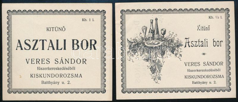 Leírás: Kitűnő asztali bor Veres Sándor fűszerkereskedéséből (Kiskundorozsma, Batthyány u. 2.), 2 db borcímke, 10x8 cm