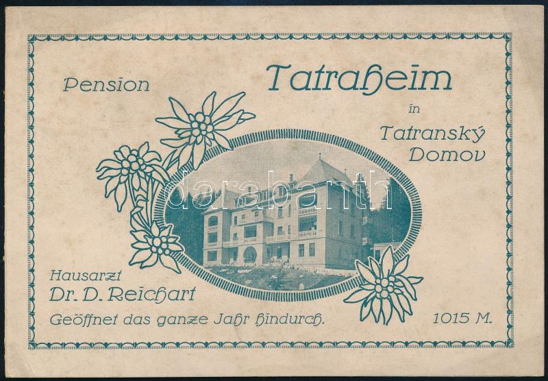 Leírás: cca 1920-30 Pension Tatraheim in Tatransky Domov, képes ismertető prospektus, német nyelven, 4 sztl. oldal, kissé foltos borítóval