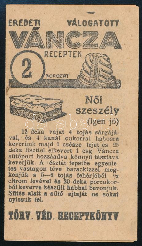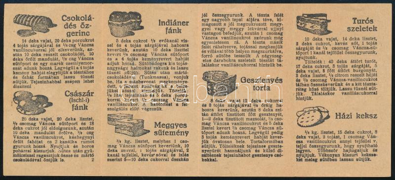 Leírás: cca 1930 Eredeti, válogatott Váncza receptek - 2. sorozat, kis reklámfüzet receptekkel, kihajtva: 19x8,5 cm