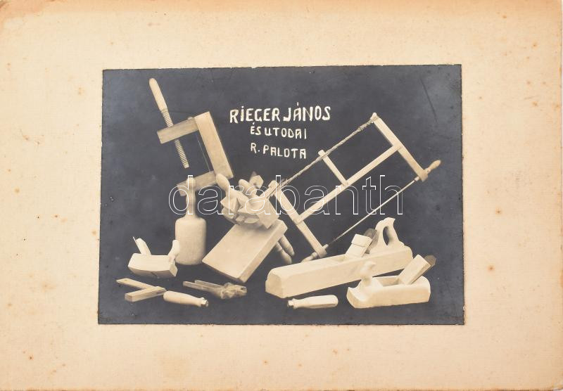 Leírás: cca 1930 Rieger János és utódai Rákospalota asztalosszerszámok, gyaluk készítőjének feliratozott reklám fotója kartonon Külső méret 25x17 cm
