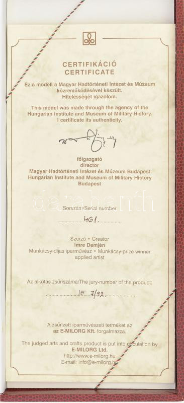 Demjén Imre (1937- ): Magyar katonai viselettörténet: Magyar öltözetű tábornok teljes dísz-/gálaegyenruhabán 1849-1918, bronz szobor alabástrom talapzaton, sorszámozott, 461. számú példány, Korsós László, a Hadtörténeti Múzeum igazgatója által aláírt hitelesítéssel, saját díszdobozában, m: 26,5 cm