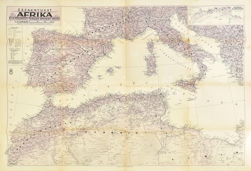 Leírás: cca 1942 Északnyugat-Afrika és a Földközi-tenger nyugati része,1:3,400.000, Bp., M. Kir. Térképészeti Intézet, hajtott, 63x63 cm hajtásoknál kis lyuk