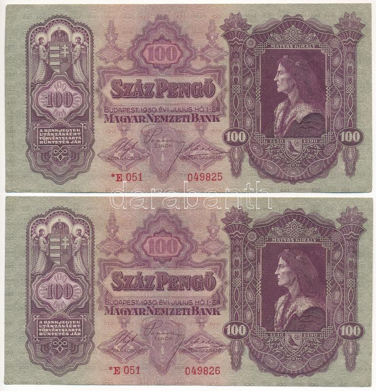 1930. 100P (2x) csillagos sorszám, sorszámkövető "*E 051 049825 - *E 0... https://www.darabanth.com/hu/460-Gyorsarveres/460.0/Numizmatika/Magyar-bankjegyek~2000008/1930-100P-2x-csillagos-sorszam-sorszamkoveto-E-051-049825-E-051-049826-egyiken-nyomdai~II3083713