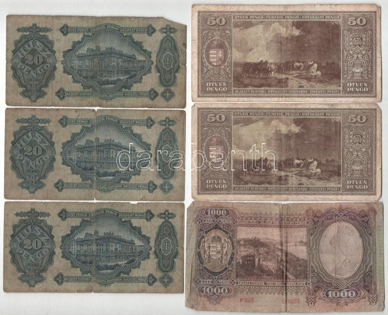 1930. 20P (3x) + 1943. 1000P + 1945. 50P (2x) T:VG https://www.darabanth.com/hu/460-Gyorsarveres/460.0/Numizmatika/Magyar-bankjegyek~2000008/1930-20P-3x-plus-1943-1000P-plus-1945-50P-2x-TVG~II3086047