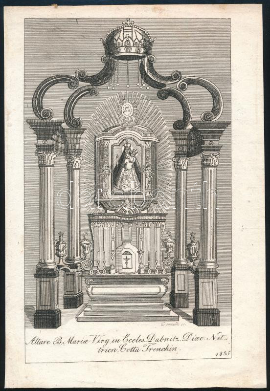 1835 Dorneck, Joseph (működött Bécsben, az 1820-1830-as években): A máriatölgyesi kegytemplom oltára (Altare B. Mariae Virg. in Eccles. Dubnitz. Dioec. Nittrien. Cottu Trenchin). Rézmetszet, papír, jelzett a metszeten, 18,5x11 cm. [In: Jordánszky Elek: Magyar országban 's az ahoz tartozó részekben lévő Bóldogságos Szűz Mária kegyelem' képeinek rövid leírása. Pozsony, 1836.]